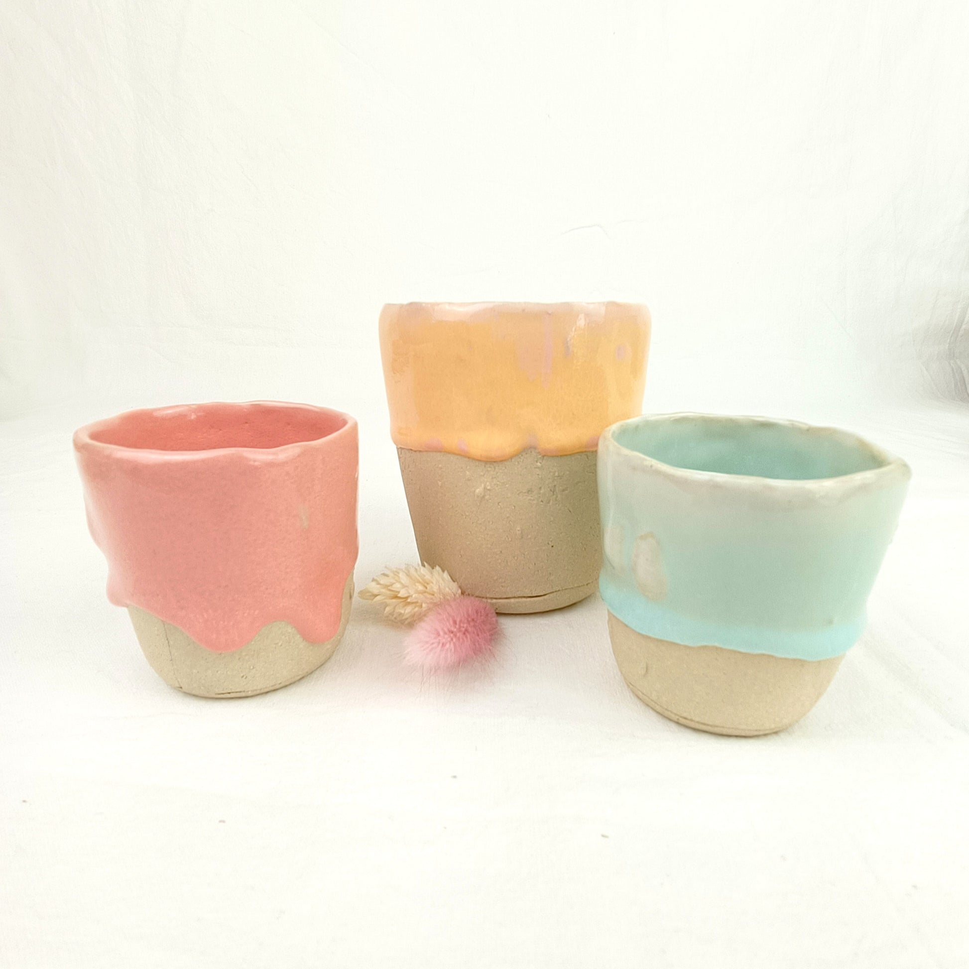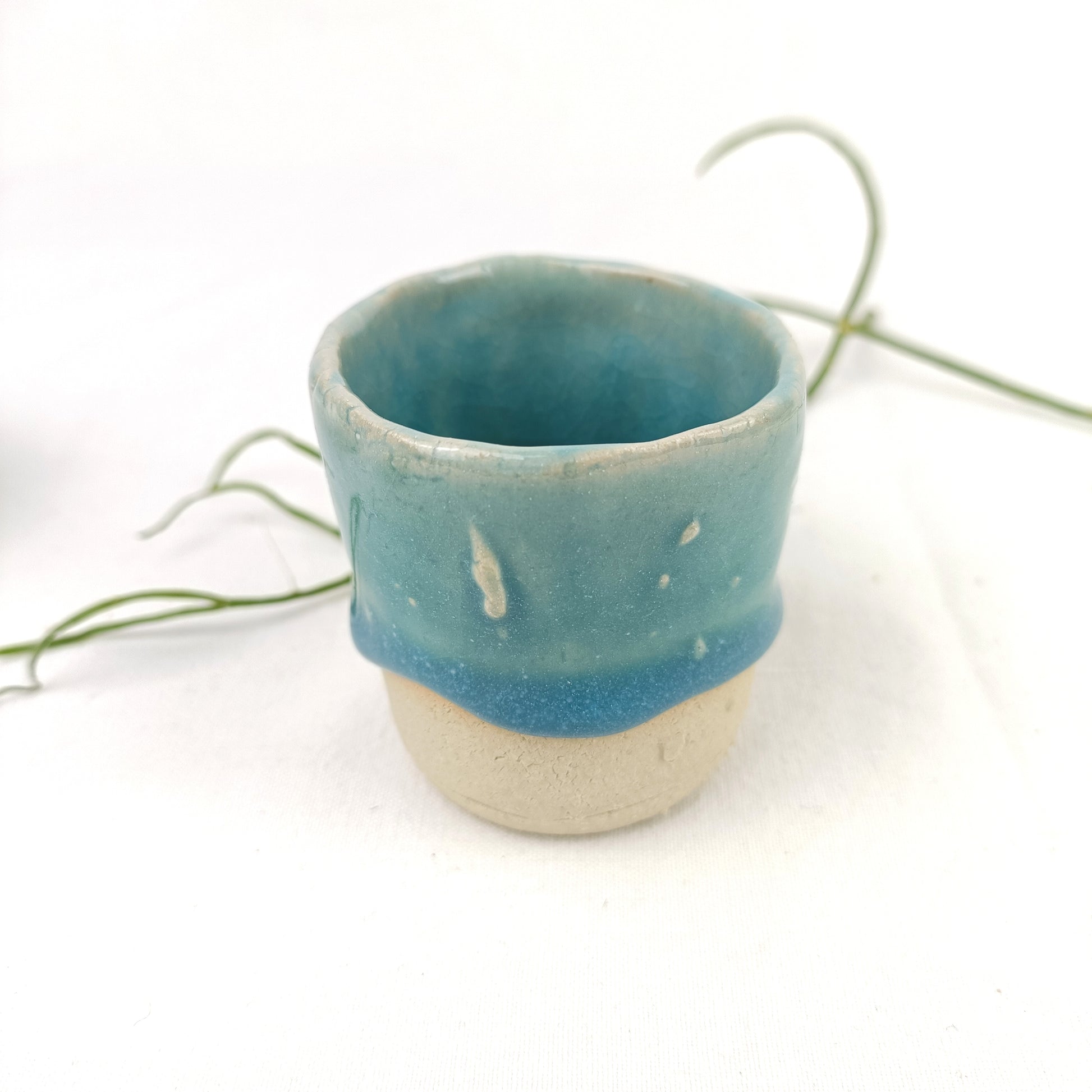Kleiner handgemachter Keramik Espressobecher, von innen und zT außen in Pastellfarben glasiert und hochgebrannt für Festigkeit und Haltbarkeit bei 1235°C.