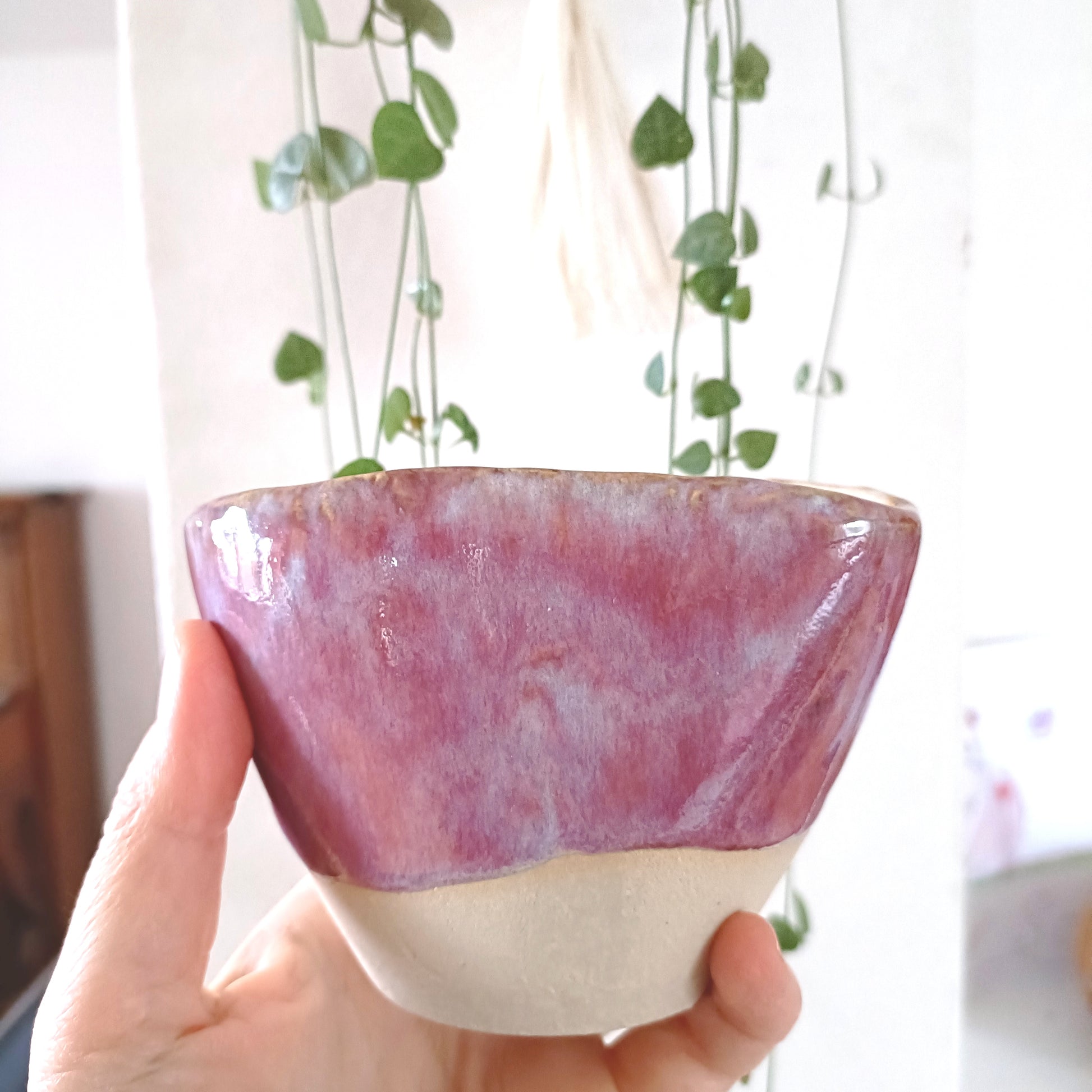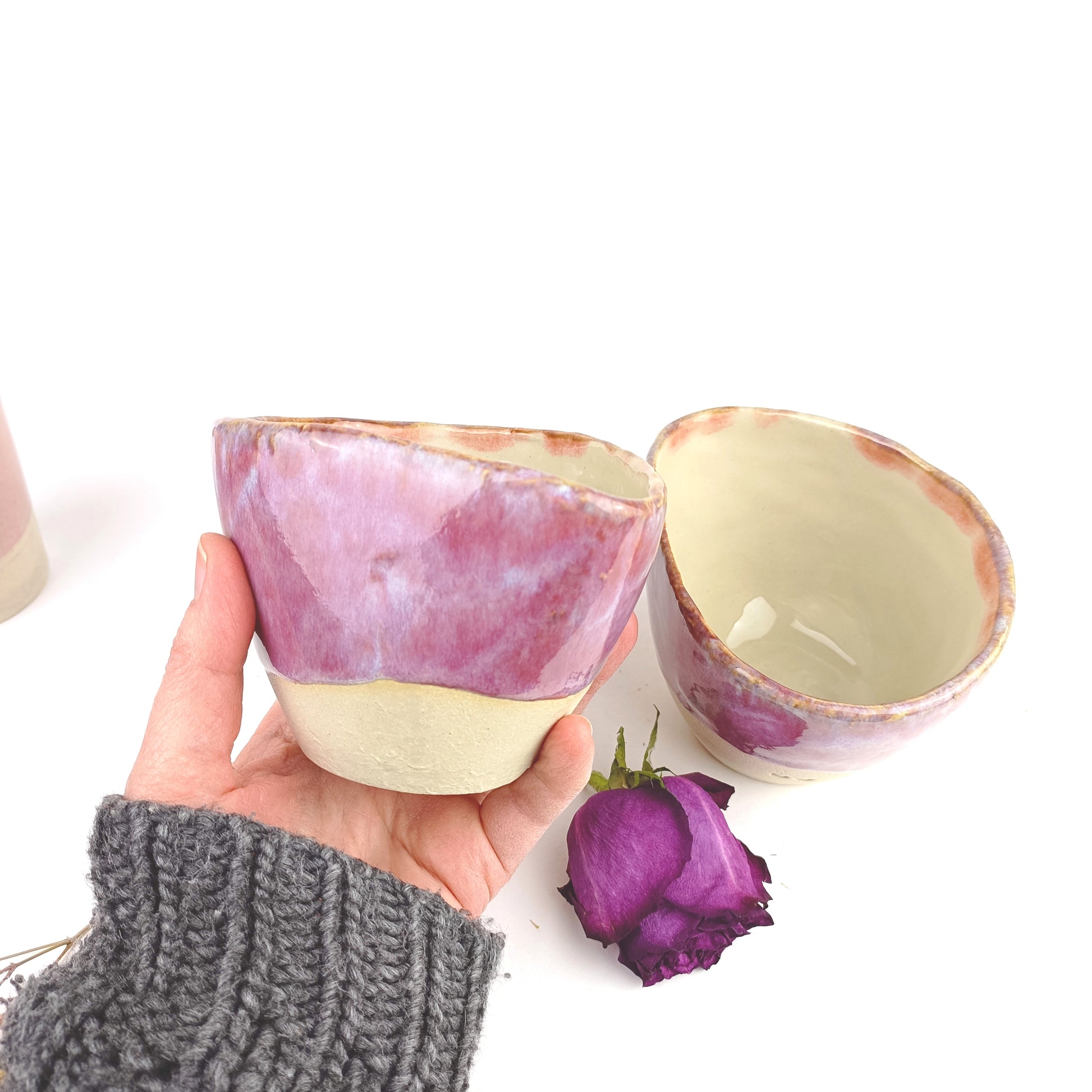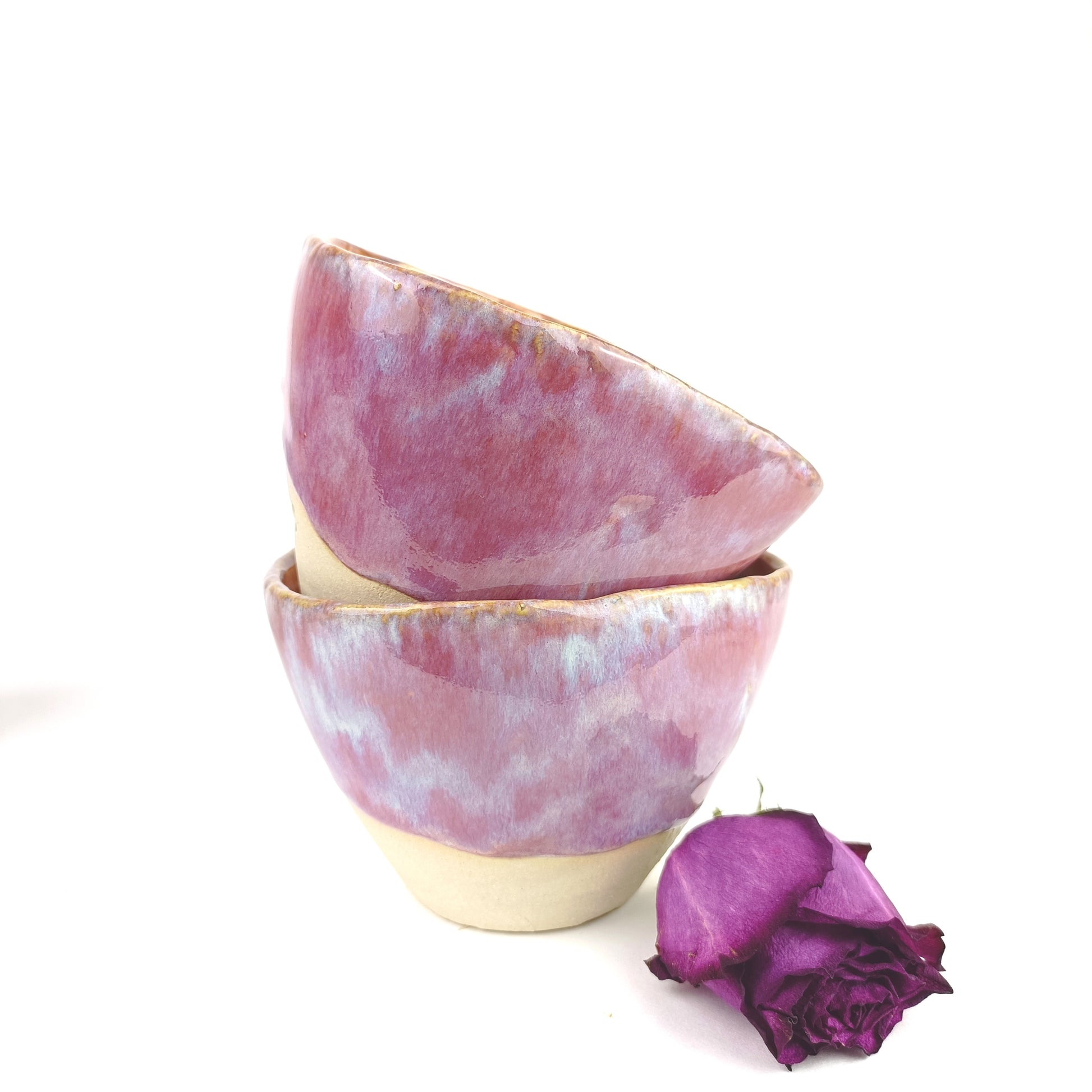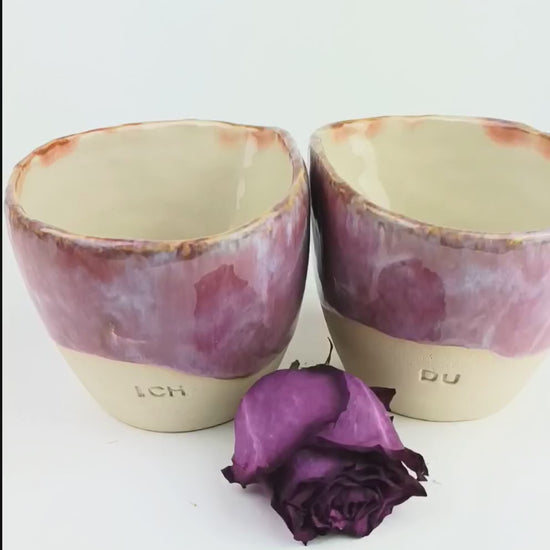 Diese Becher wurden in liebevoller Handarbeit gefertigt und bestechen durch schlichtes, zeitloses Design. Die klare Form lenkt den Blick auf die besondere Glasur: ein lebendiges Farbspiel aus Pink und Lila, das jeden Becher zu einem Unikat macht.