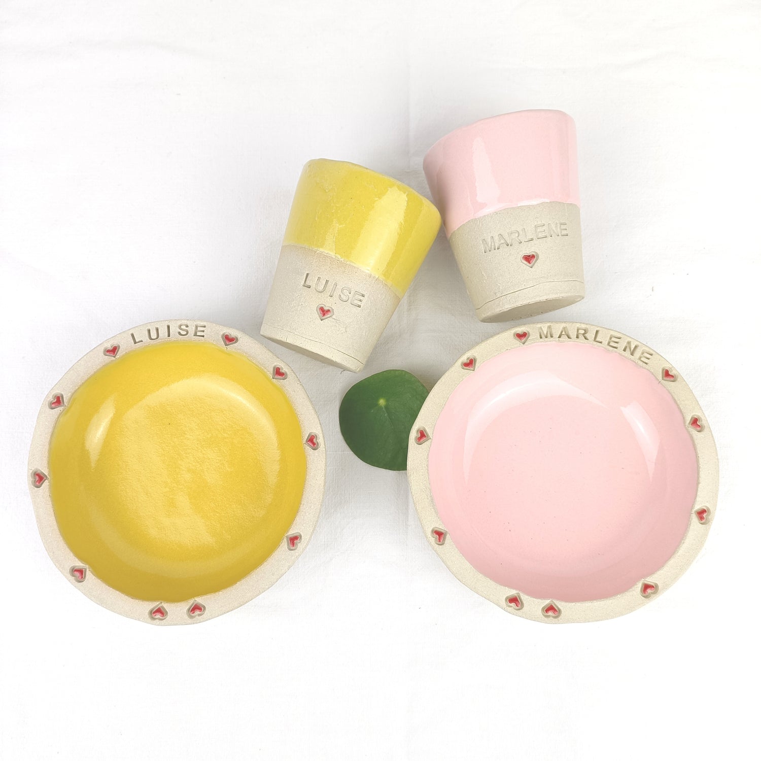 Mit deinem Wunschtext – z. B. dem Namen deines Kindes – mache ich das Geschirr zu einem ganz persönlichen Einzelstück. Die Gravur wird dauerhaft eingebrannt und bleibt auch nach vielen Spülgängen wunderschön erhalten.